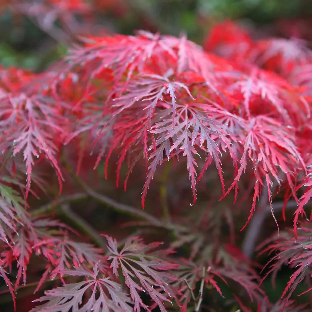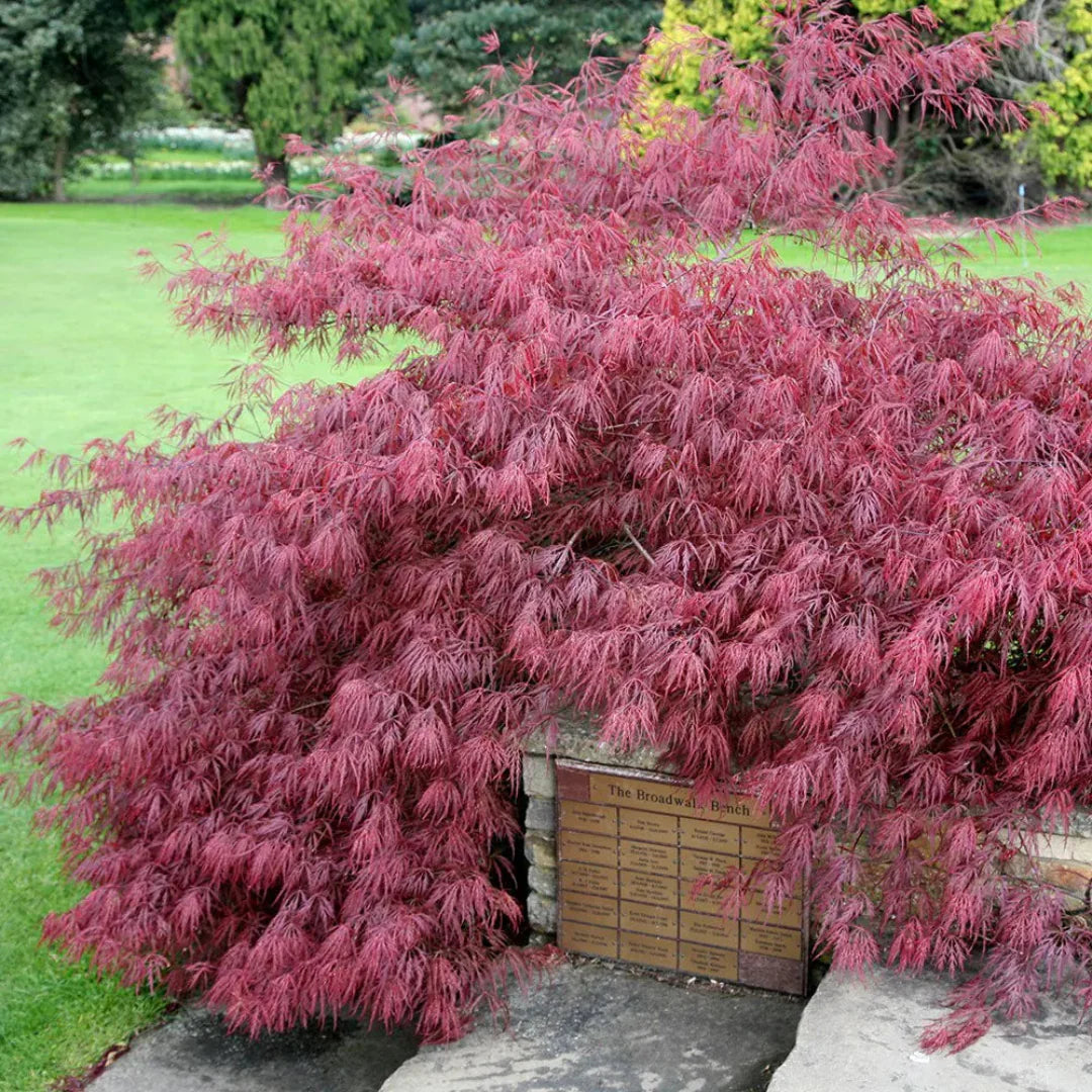 Garnet Japanese Maple is a graceful, lace-leaf ornamental tree prized for its deep garnet-red foliage that keeps its rich color throughout the growing season. The finely cut leaves create a soft, cascading appearance, adding elegance to any landscape.
