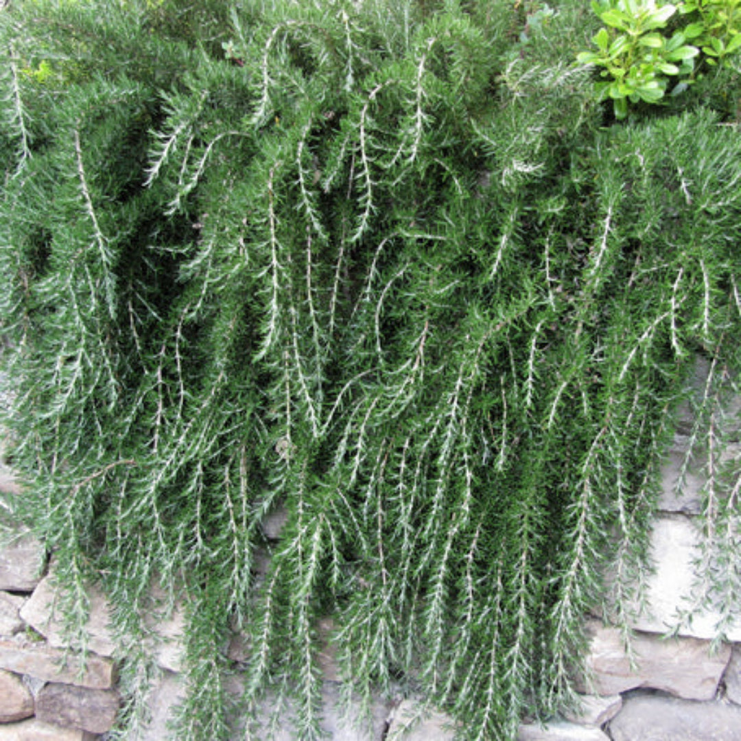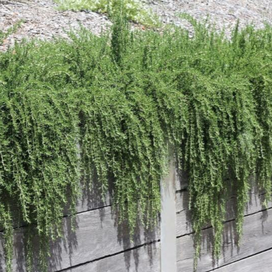 Rosmarinus officinalis ‘Prostratus’, commonly known as Trailing Rosemary, is a fragrant, evergreen groundcover with soft, needle-like foliage and delicate light blue flowers in spring. Its graceful, cascading habit makes it ideal for rock gardens, containers, slopes, or retaining walls. Low-growing and drought-tolerant, this aromatic shrub is both ornamental and functional.