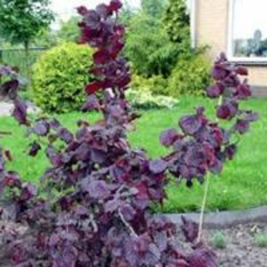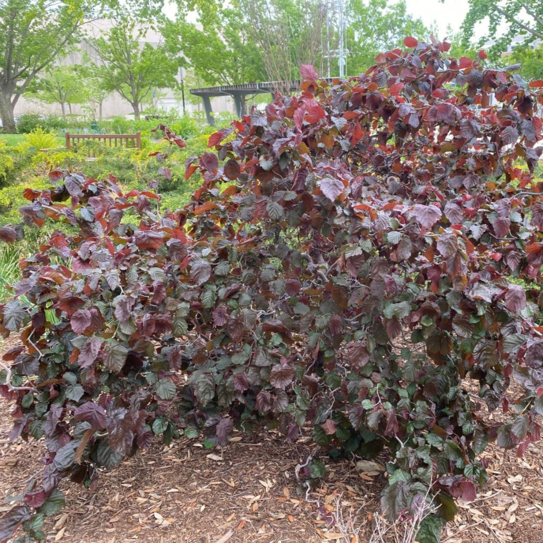 'Red Dragon' Harry Lauder’s Walking Stick is a highly ornamental shrub prized for its twisted, contorted branches and rich burgundy-red leaves. In spring, it produces golden-yellow catkins, followed by lush, colorful foliage that holds its deep red tones throughout summer before turning shades of purple and bronze in fall. Its unusual form and brilliant foliage make it an ideal focal point for landscapes and gardens.