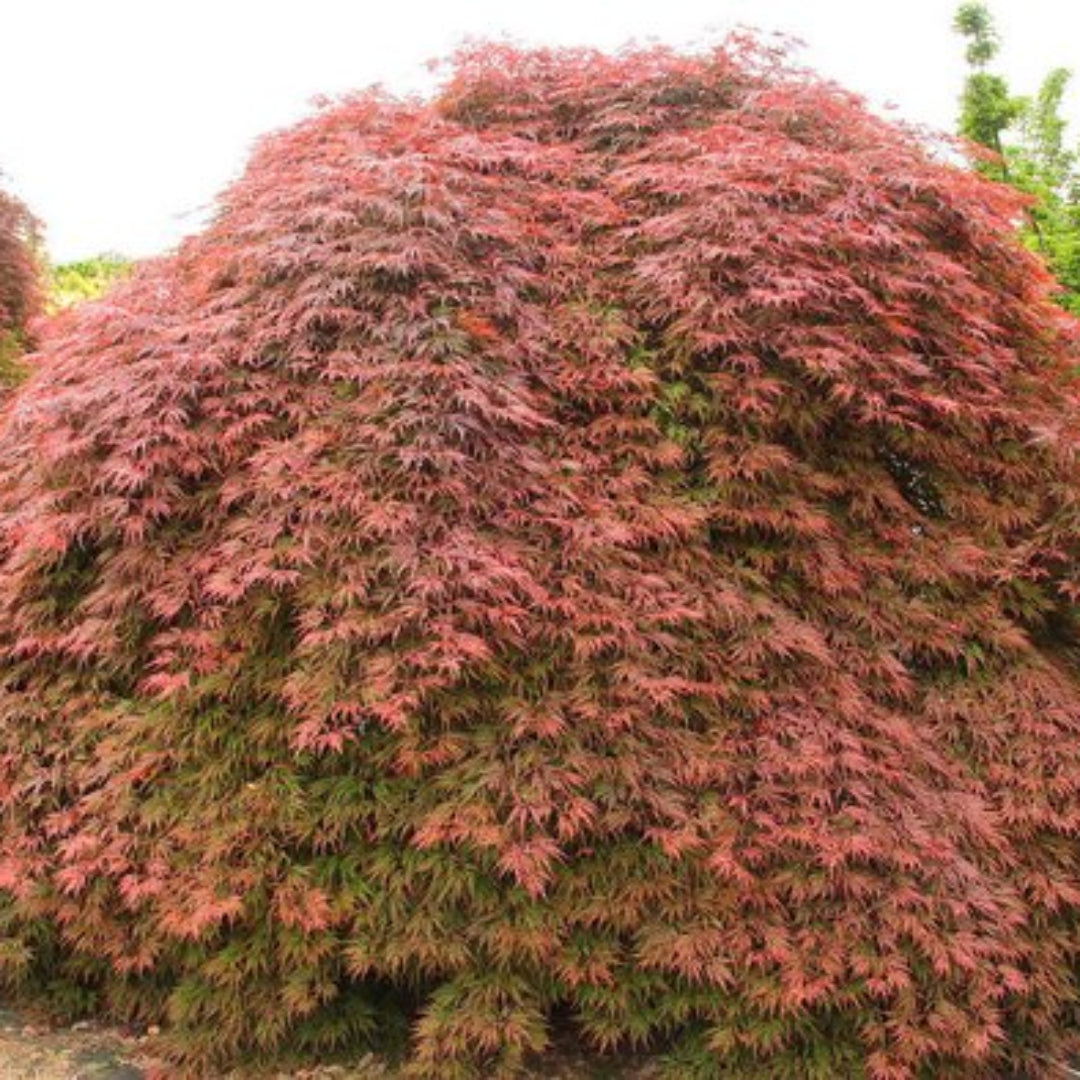 Orangeola Japanese Maple is a spectacular laceleaf variety featuring a cascading, weeping growth habit and vibrant color changes throughout the year. In spring, its finely dissected leaves emerge bright orange-red, gradually turning deep green with red overtones in summer, before igniting into vivid orange and crimson tones in fall.
