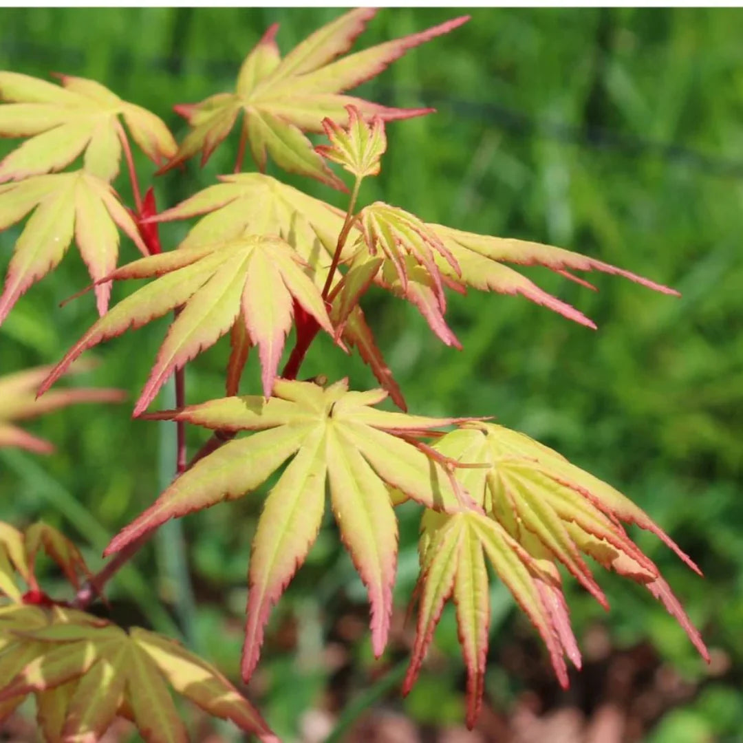 The 'Beni Kawa' Japanese Maple is a stunning ornamental tree prized for its vibrant, coral-red bark that provides striking winter interest �. In spring, delicate green leaves emerge, turning rich green in summer before igniting into golden-yellow and crimson-red tones in autumn �.
