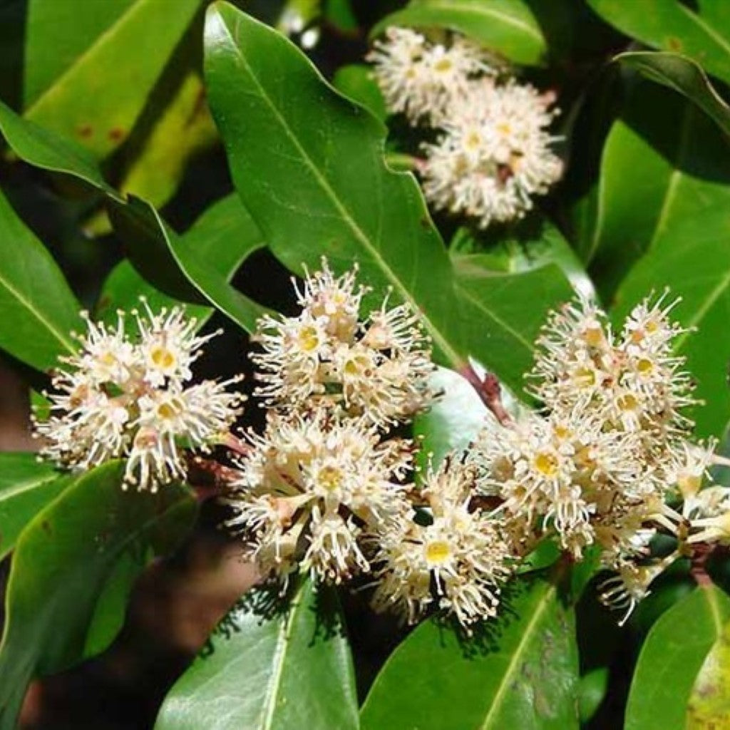 Cherry Ruffles Cherry Laurel is a large evergreen shrub or small tree with a dense upright domed habit. Its dark green aromatic foliage with wavy margins emerges yellow-green to bronze and smells like cherries when bruised. Upright panicle clusters of extremely fragrant creamy white flowers bloom in spring and are followed by small drupes in summer. In warmer climates, flowers best in part sun and rich moist well-drained soils. Tolerates urban conditions and poor soil.