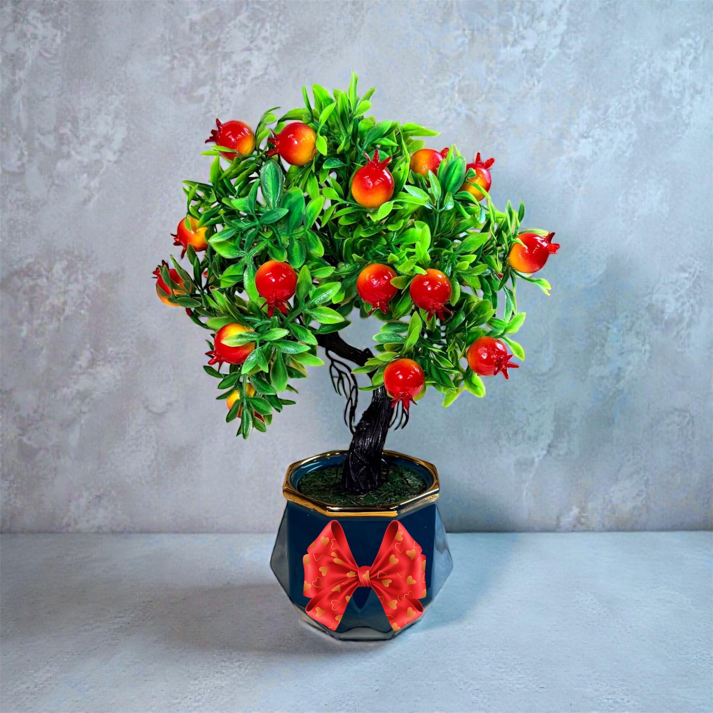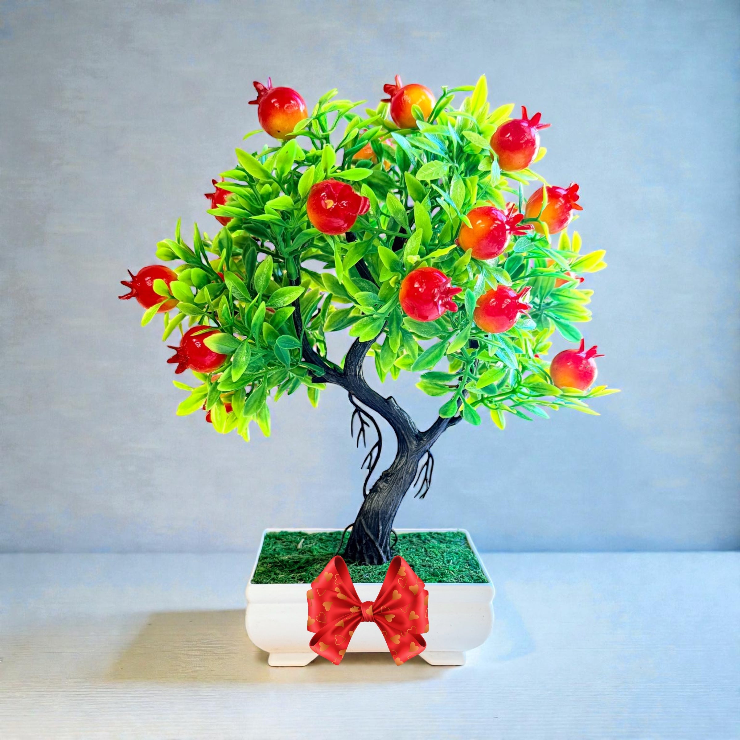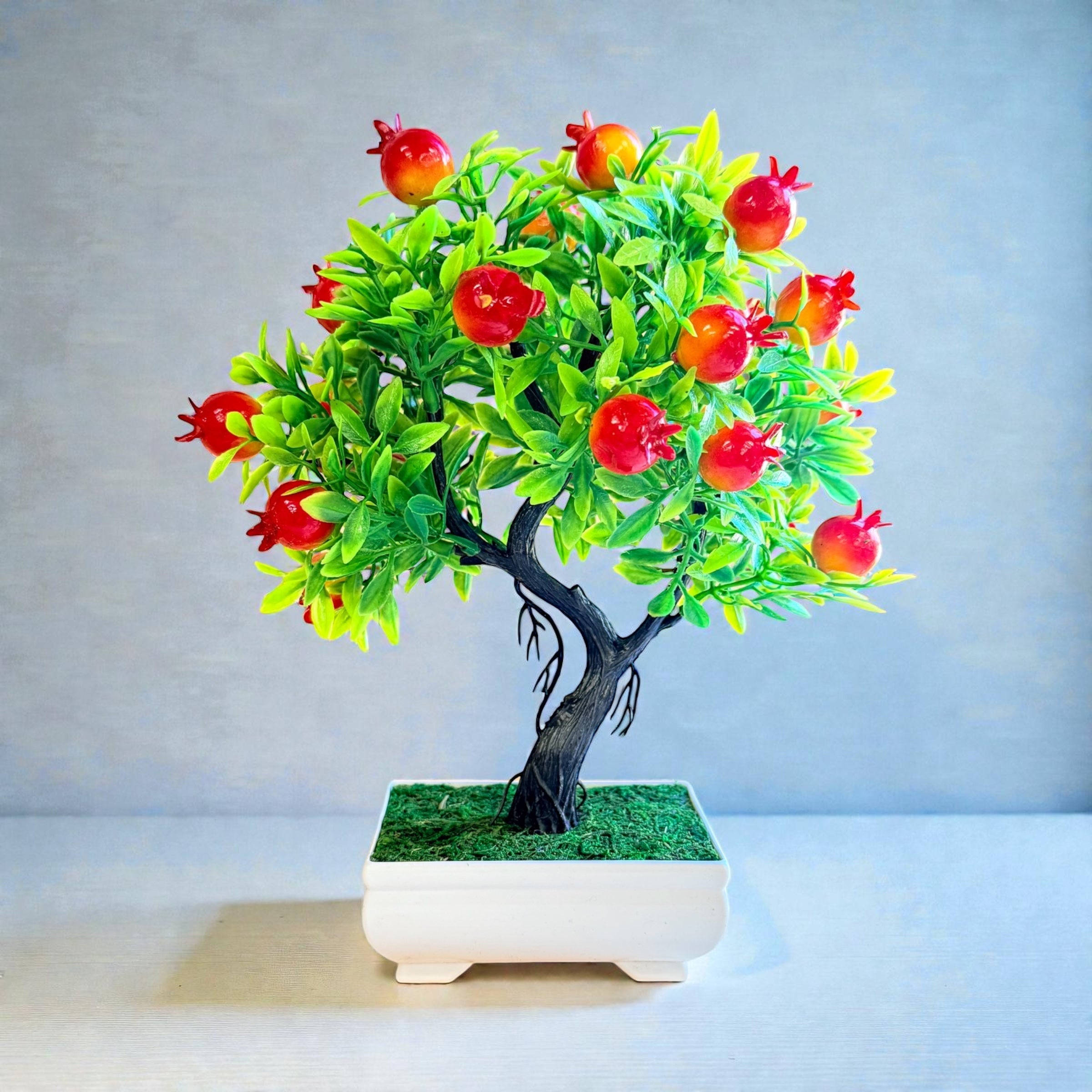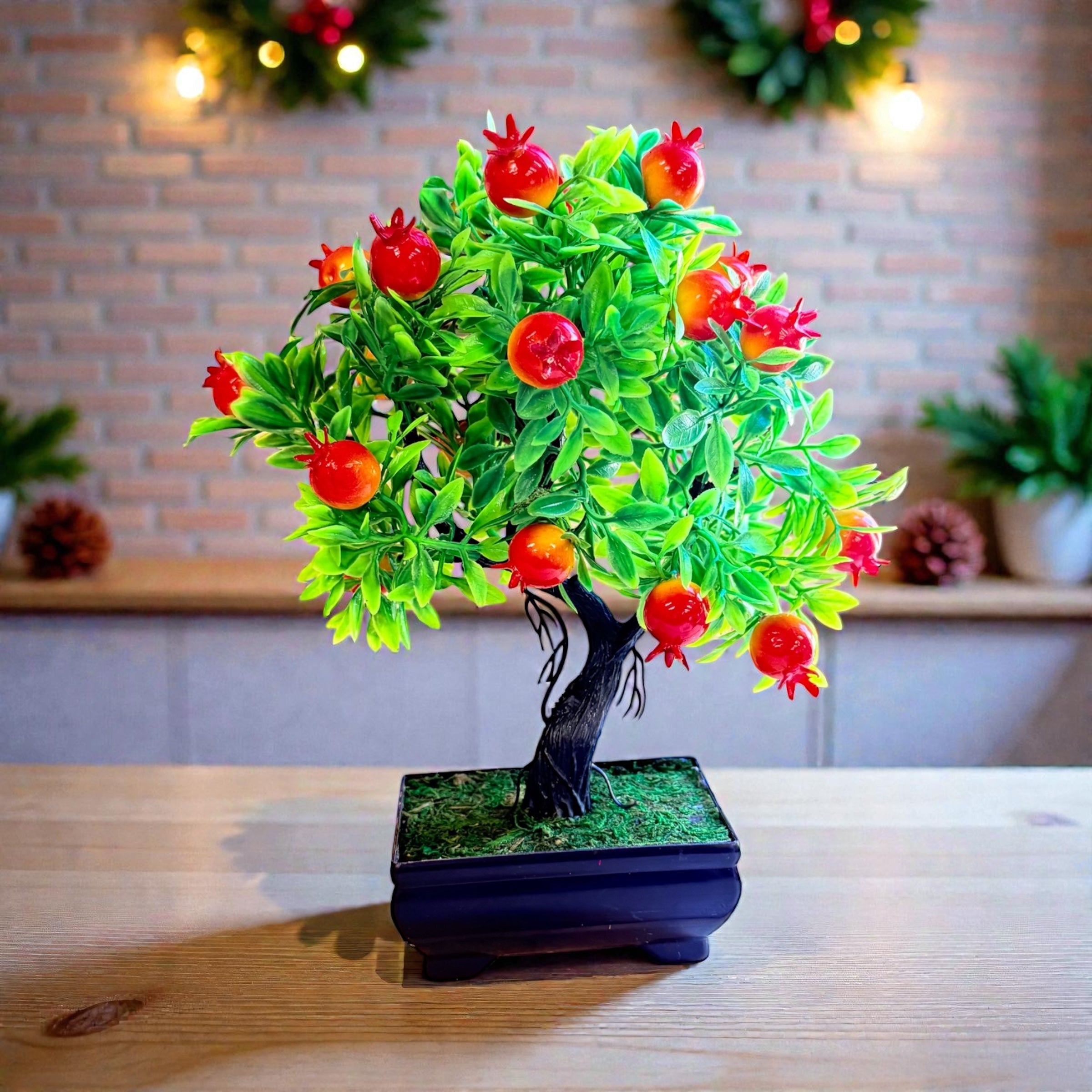 Add charm and color to any space with this realistic Artificial Pomegranate Bonsai Tree. Crafted with exquisite detail, it features vibrant red pomegranates and lush green leaves that look and feel incredibly lifelike. This elegant mini tree brings the essence of nature indoors—without the need for sunlight, watering, or trimming.