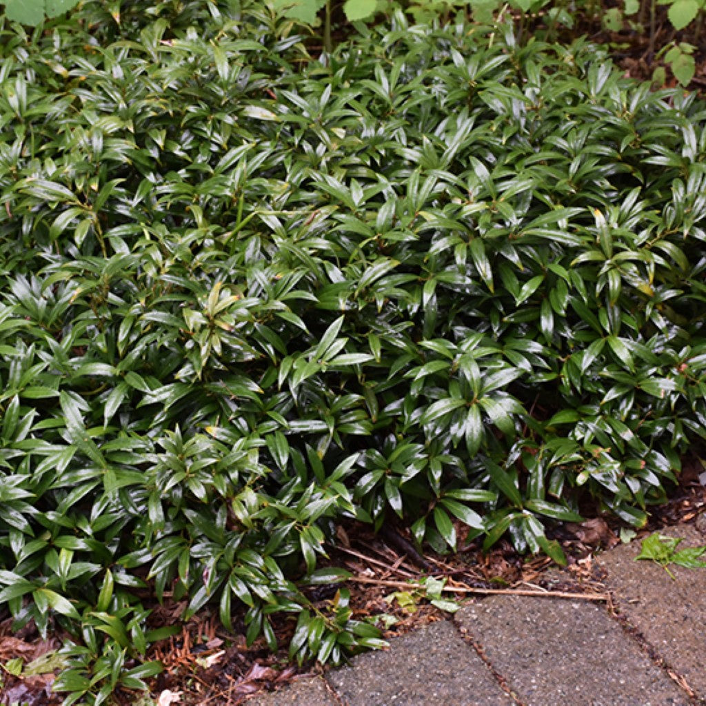 A great groundcover for the shade garden! The polished appearance of the dark green leaves creates a clean-looking, uniform appearance. Fragrant white flowers are followed by blue-black fruit. Tolerant of dry shade and urban conditions, thriving with little care. Evergreen.