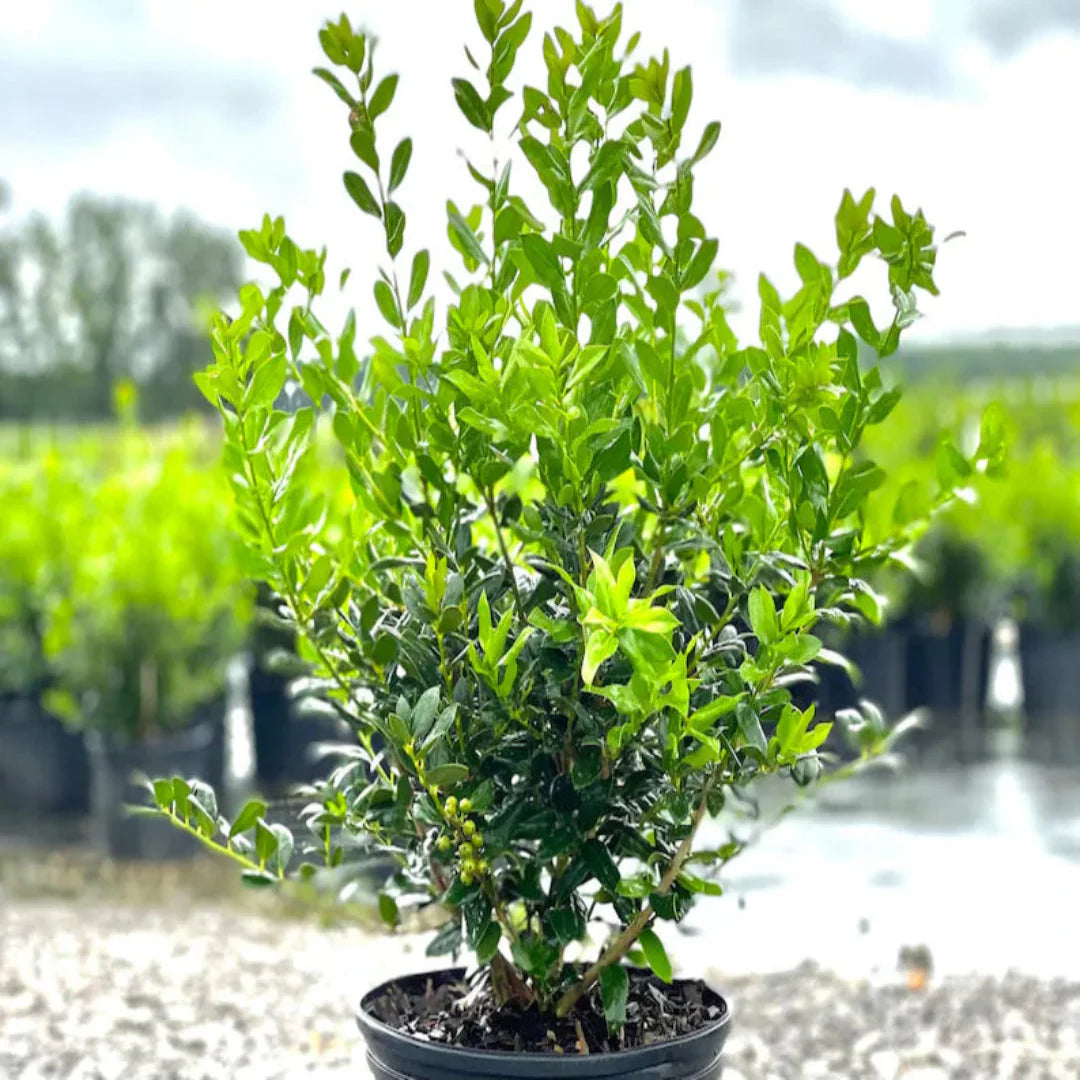 The Needlepoint Holly is an attractive evergreen shrub prized for its slender, pointed leaves and abundant bright red berries that appear in fall and persist through winter. Its dense, arching branches make it a great choice for hedges, borders, or foundation plantings, adding both structure and seasonal color to the landscape.