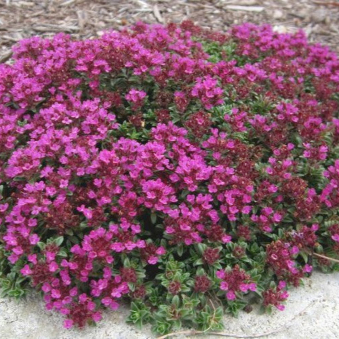 'Coccineus' is a vibrant and aromatic creeping thyme variety that forms a dense mat of evergreen foliage and bursts into bright magenta-red blooms in early to mid-summer. It's a favorite for filling in gaps between stepping stones and adding color to rock gardens.