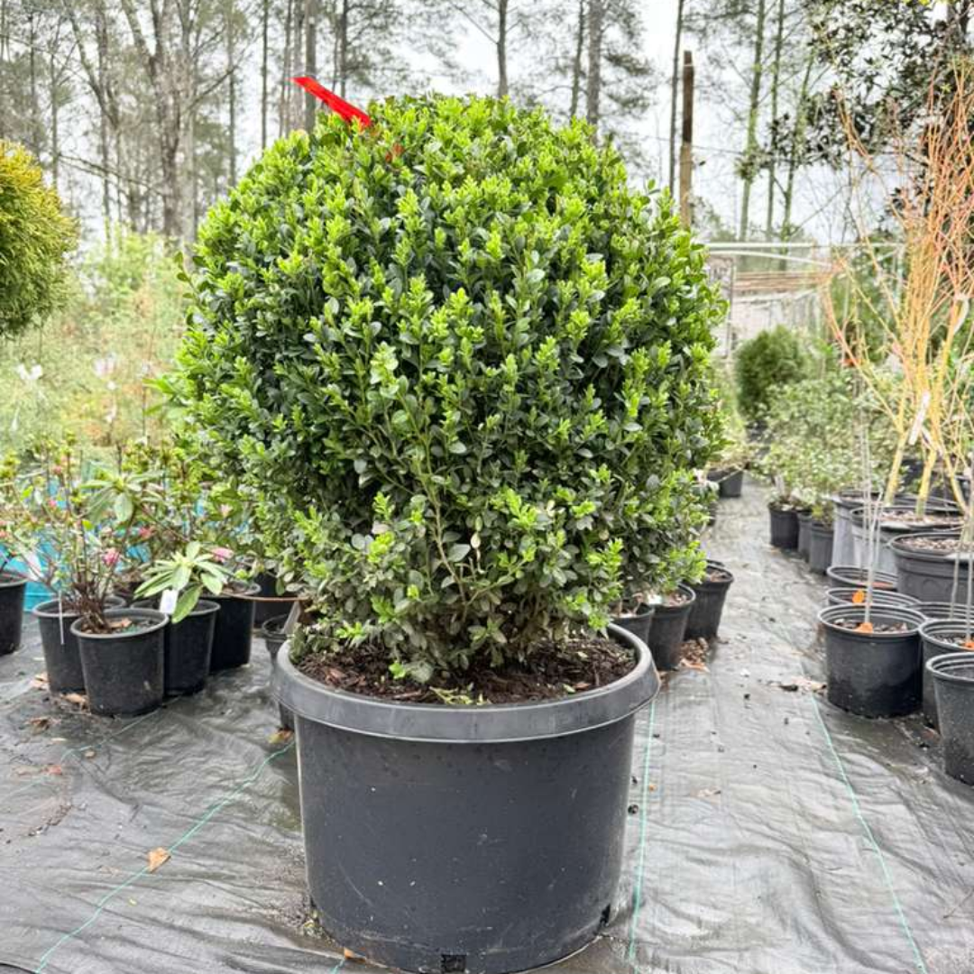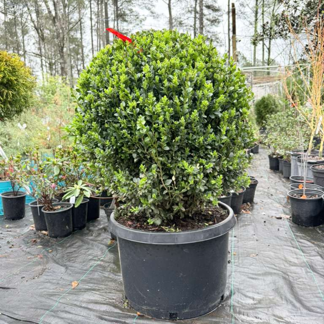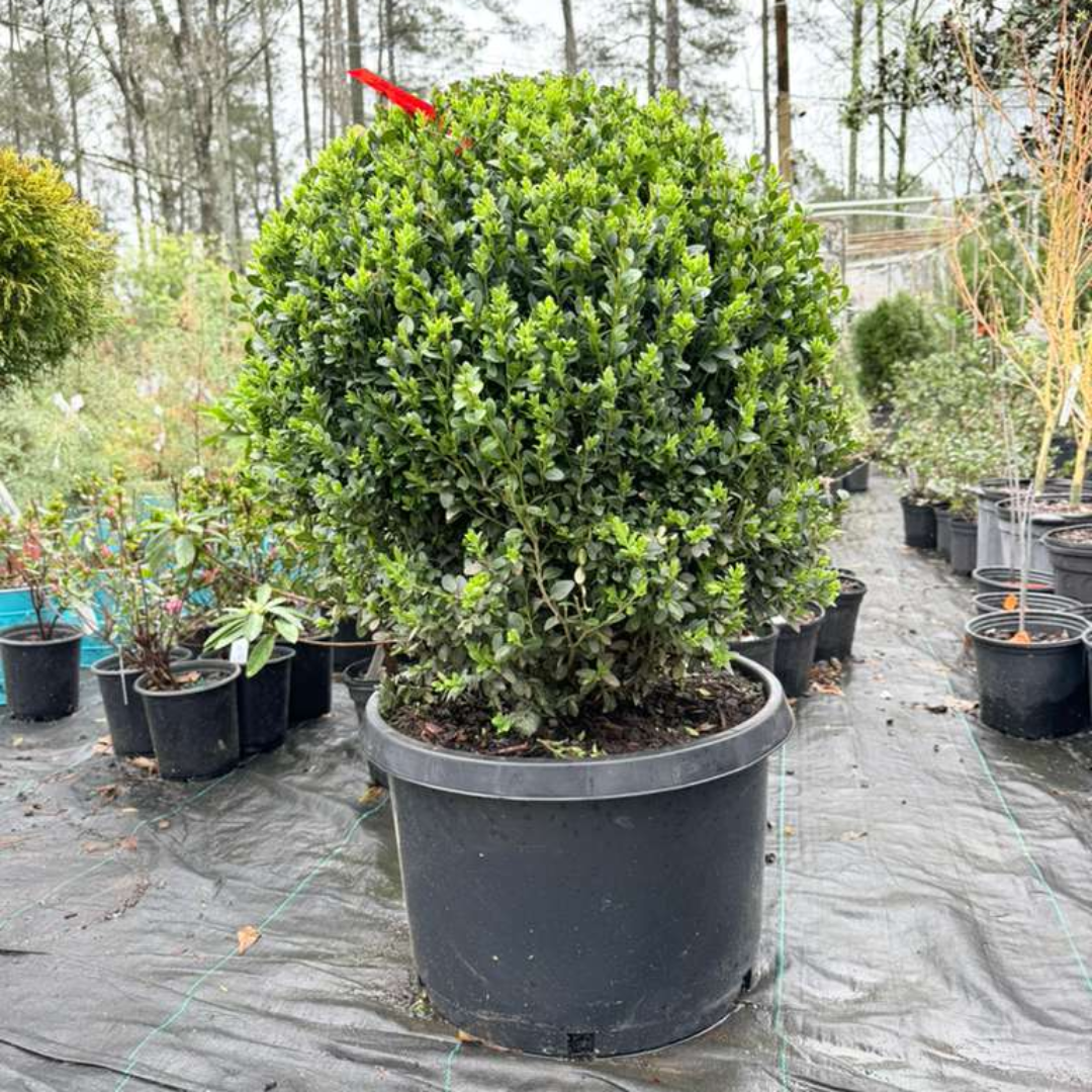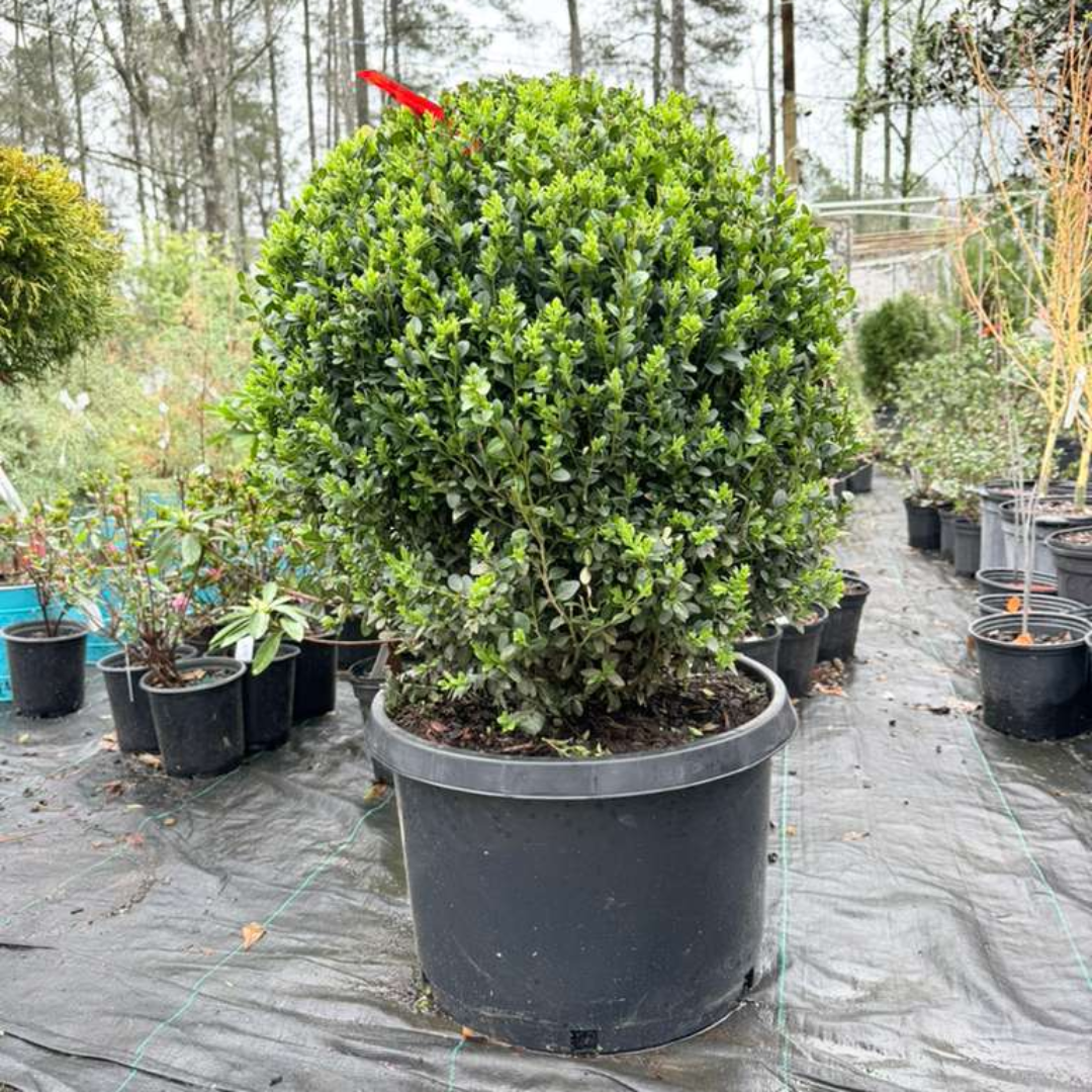 Topiary Boxwood Green Mountain Globe is a beautiful evergreen shrub shaped into a classic globe form, perfect for elegant landscapes and formal gardens. Its dense green foliage keeps its vibrant color throughout the year, making it a favorite for decorative topiary displays.