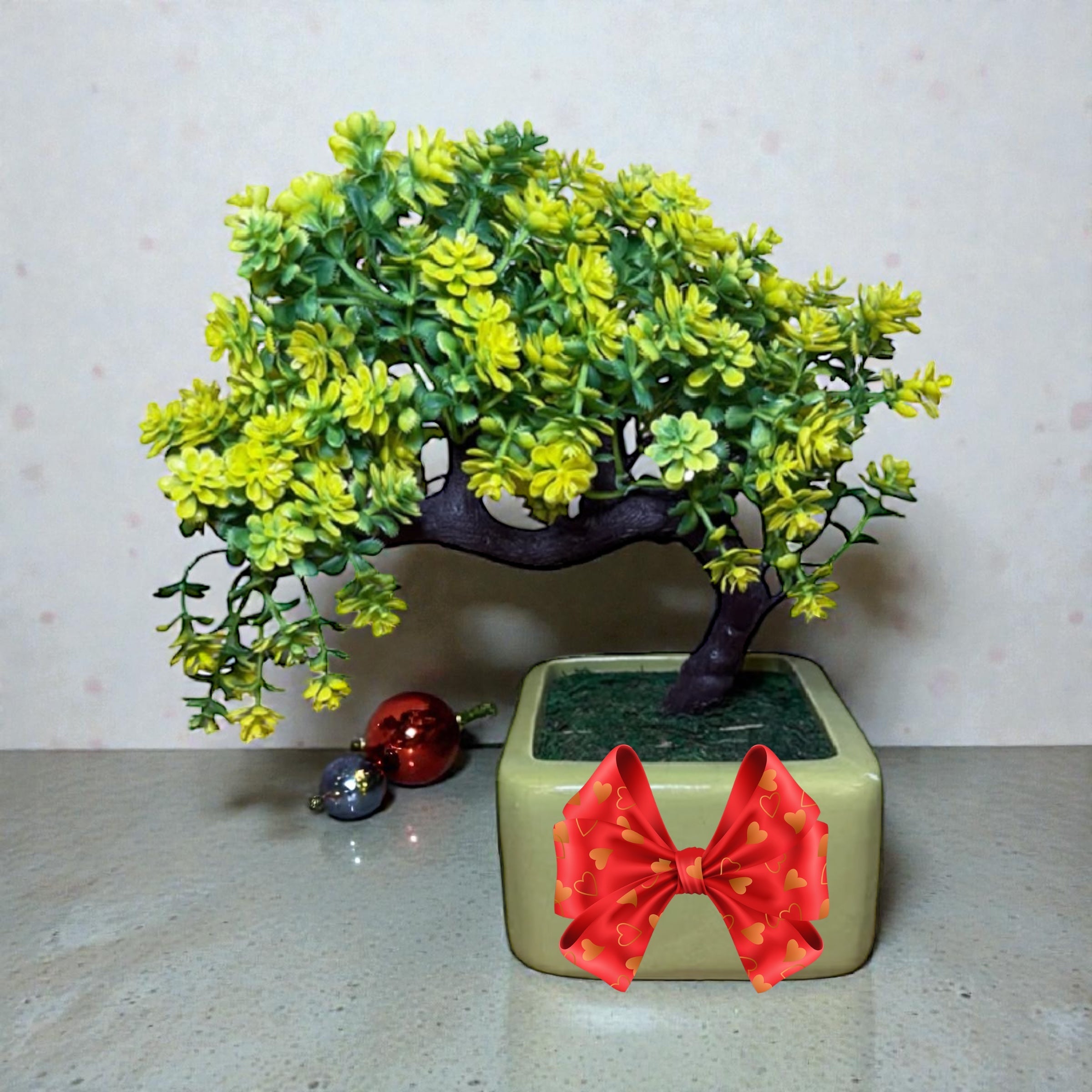The Gorgeous Yellow and Green Bonsai combines the art of bonsai with bright, cheerful foliage in tones of gold and green. Its compact size and vibrant leaves make it a stunning decorative piece that also carries symbolic meaning of peace, prosperity, and balance.